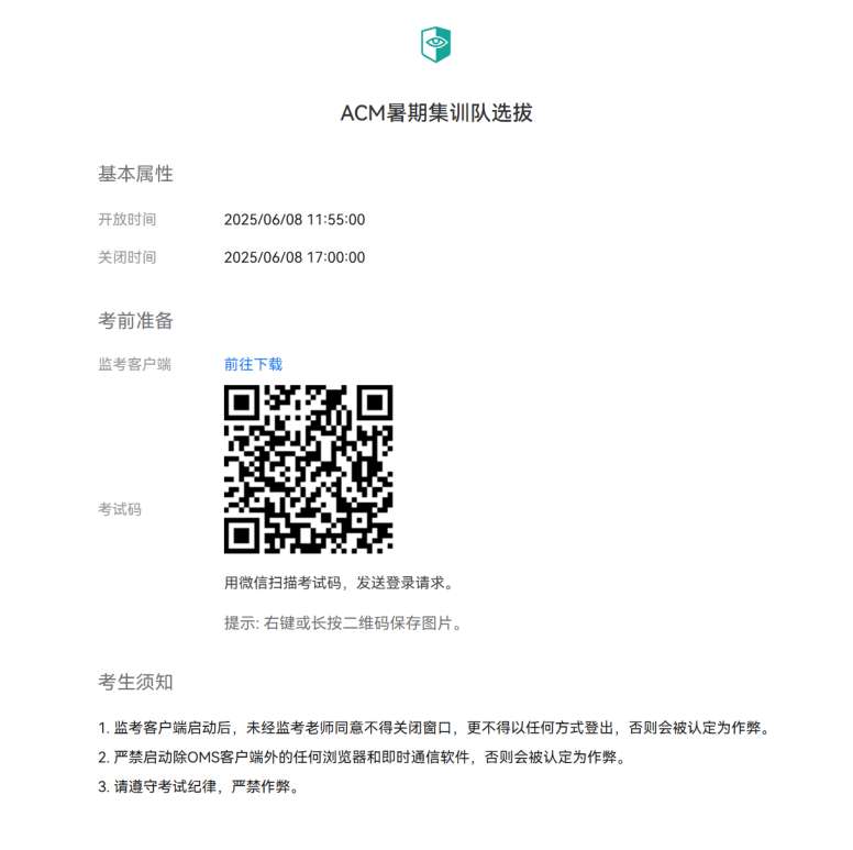 2、 本次比赛按照惯例使用OMS系统实行线上+线下监考和反作弊,须自行准备考试需要的机器和环境。请提前安装OMS系统,请按照《OMS用户自测流程》完成本地考试条件测试,可参考教学视频《如何搞定OMS监考系统》 以及补充视频《OMS踩坑排雷攻略》。