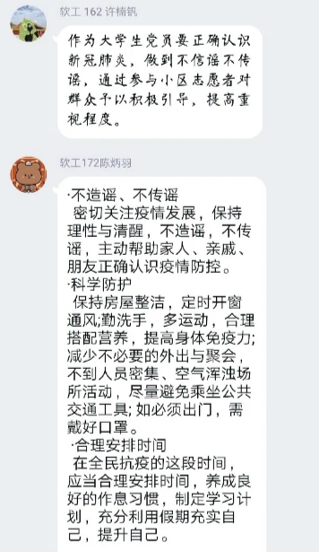 通过线上讨论一系列疫情防控文件精神,对防控新冠肺炎的看法和注意事项,以及作为大学生党员在这次新冠肺炎疫情中能做些什么,让广大学生党员同志学习更多的关于新型肺炎病毒的防控知识,在这场疫情防控阻击战中做到不信谣、不传谣、不造谣,做好正确的舆论引导,运用学习的专业知识,为疫情防控出一份力,坚决打赢疫情防控阻击战!