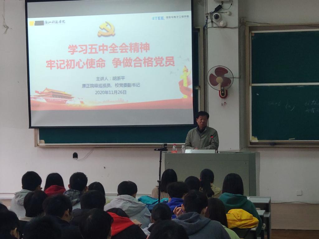 本次活动邀请到了浙江科技双赢彩票 关工委常务副主任,原党委副书记胡浙平老师为我们深入讲解十九届五中全会精神,胡书记首先向我们描述了我国现阶段取得的一系列成果,其中包括粮食产量连续五年破万亿以上,5575万农村贫困人口脱贫等等,同时还深入分析了我国目前面临的国际局势,以及在新冠疫情下我国所展现的强大力量。最后,胡书记还从四个方面分析青年大学生如何争取入党,做合格党员,坚定了同学们爱党爱国的理想信念。