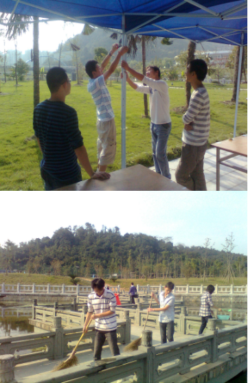 开展的系列庆祝活动当起了“义工”,我们把大团队分成了几个小组前往不同的活动地点。有在湖心亭茶楼接待校友的,他们认认真真地站在各个路口,为来校的校友指路,有的甚至直接把校友送到活动地点。有在行政楼图书馆布置会议室的,他们搬桌子擦椅子干得灰尘满面却依然笑呵呵的,也有在圆形广场打扫活动场地的,一个个干得可起劲儿啦!