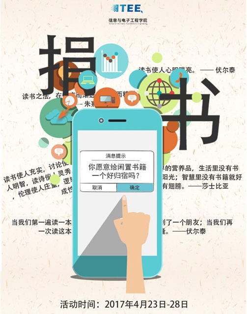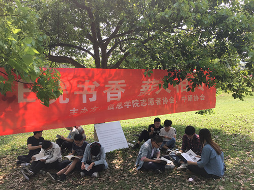 2017年4月23日,由信息中研会与志协供共同举办的e院书香读书会暨薪火相传捐书活动开幕式在大草坪正式拉开帷幕。随着世界读书日的来临,此次活动同学们享受到了阅读纸质书的乐趣,并能在推荐、分享书籍中别有一番感悟。