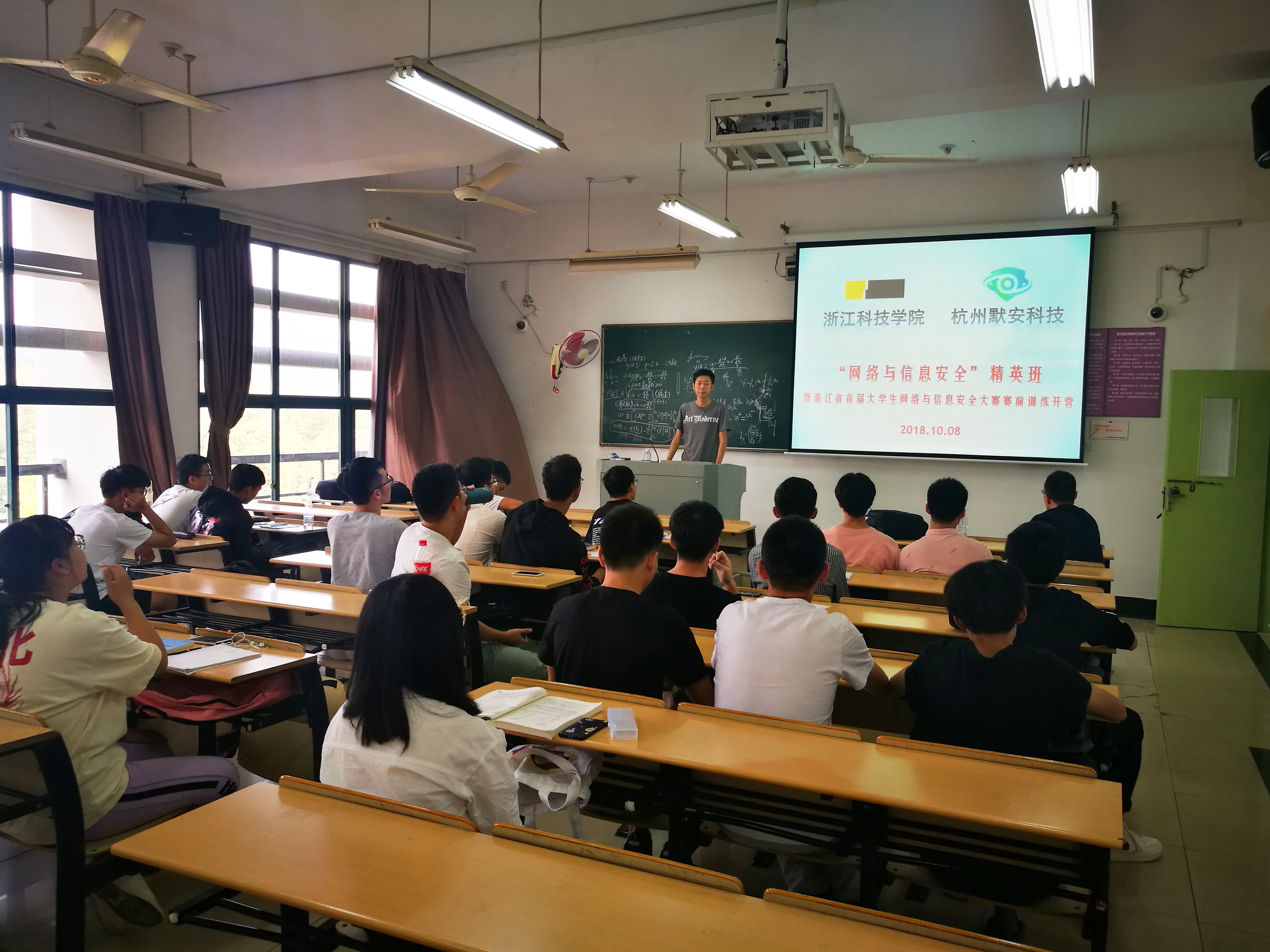 与杭州默安科技联合举办的“网络与信息安全精英班”暨“网络安全竞赛训练营”开营,来自全校50多位同学参加开营课程。