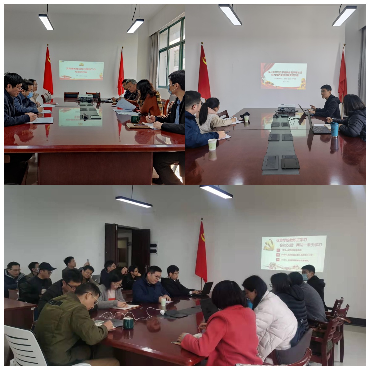 党组织开展理论学习中心组专题学习,结合教职工政治理论学习及党支部主题党日活动契机,纪委全体成员进联系支部、系部进行专题普法宣讲,组织全体教职工重点学习了省纪委省监委“两法一条例”专题讲座视频。在双赢彩票