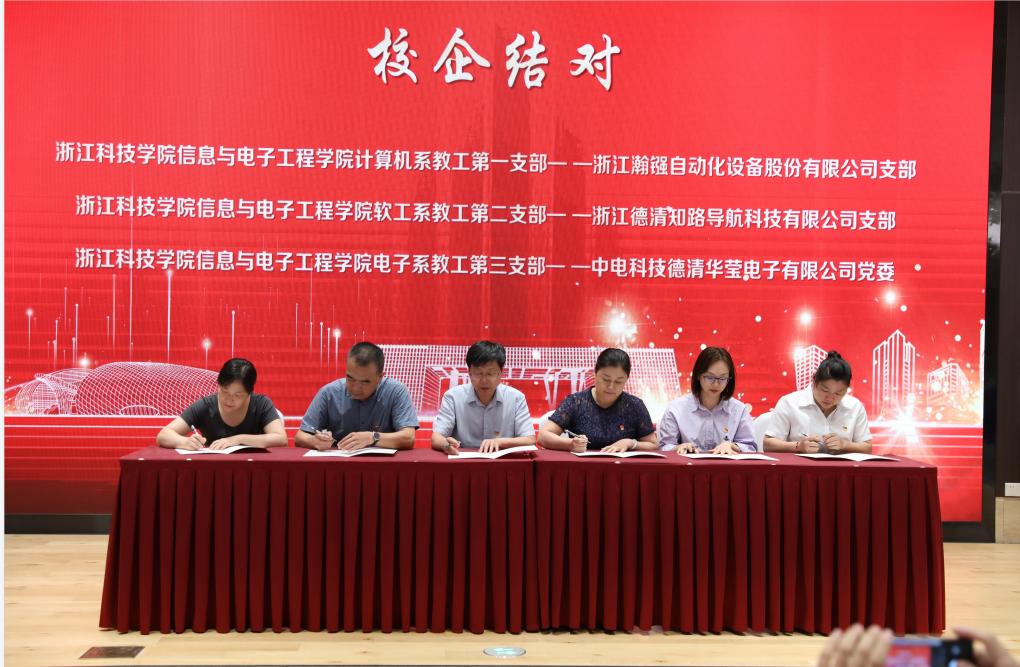 三个教工支部分别与浙江瀚镪自动化设备股份有限公司支部、浙江德清知路导航科技有限公司支部和中电科技德清华莹电子有限公司党委进行校企结对。