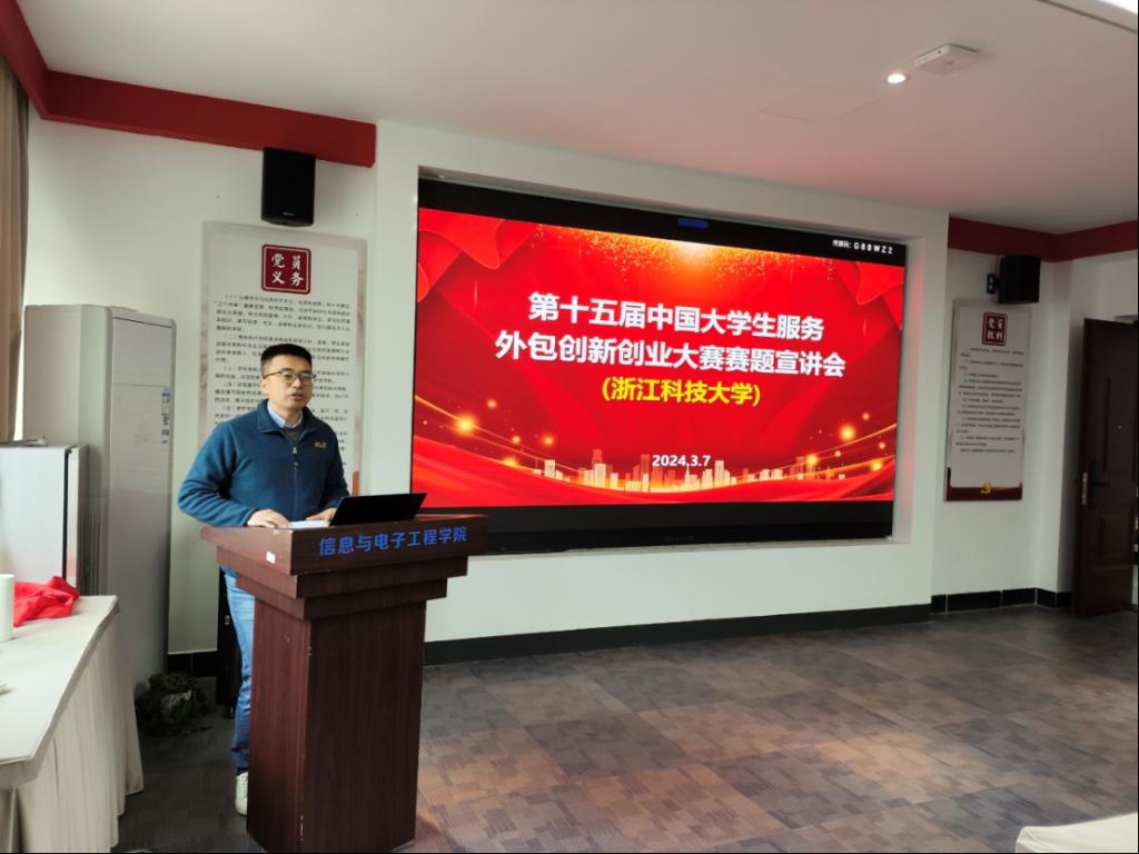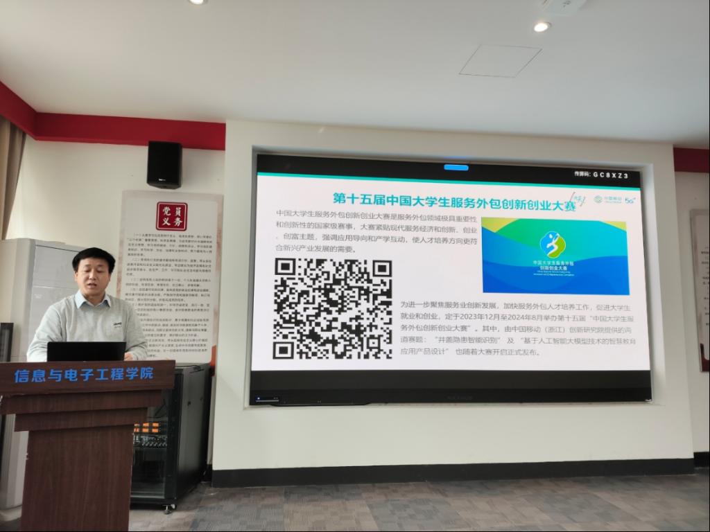 于2024年3月7日举行第十五届中国大学生服务外包创新创业大赛赛题宣讲会,邀请中国移动(浙江)创新研究院资深专家解读赛题,分享前沿技术。会议最后为“九天杯”人工智能技术挑战赛获奖学生进行了颁奖。
